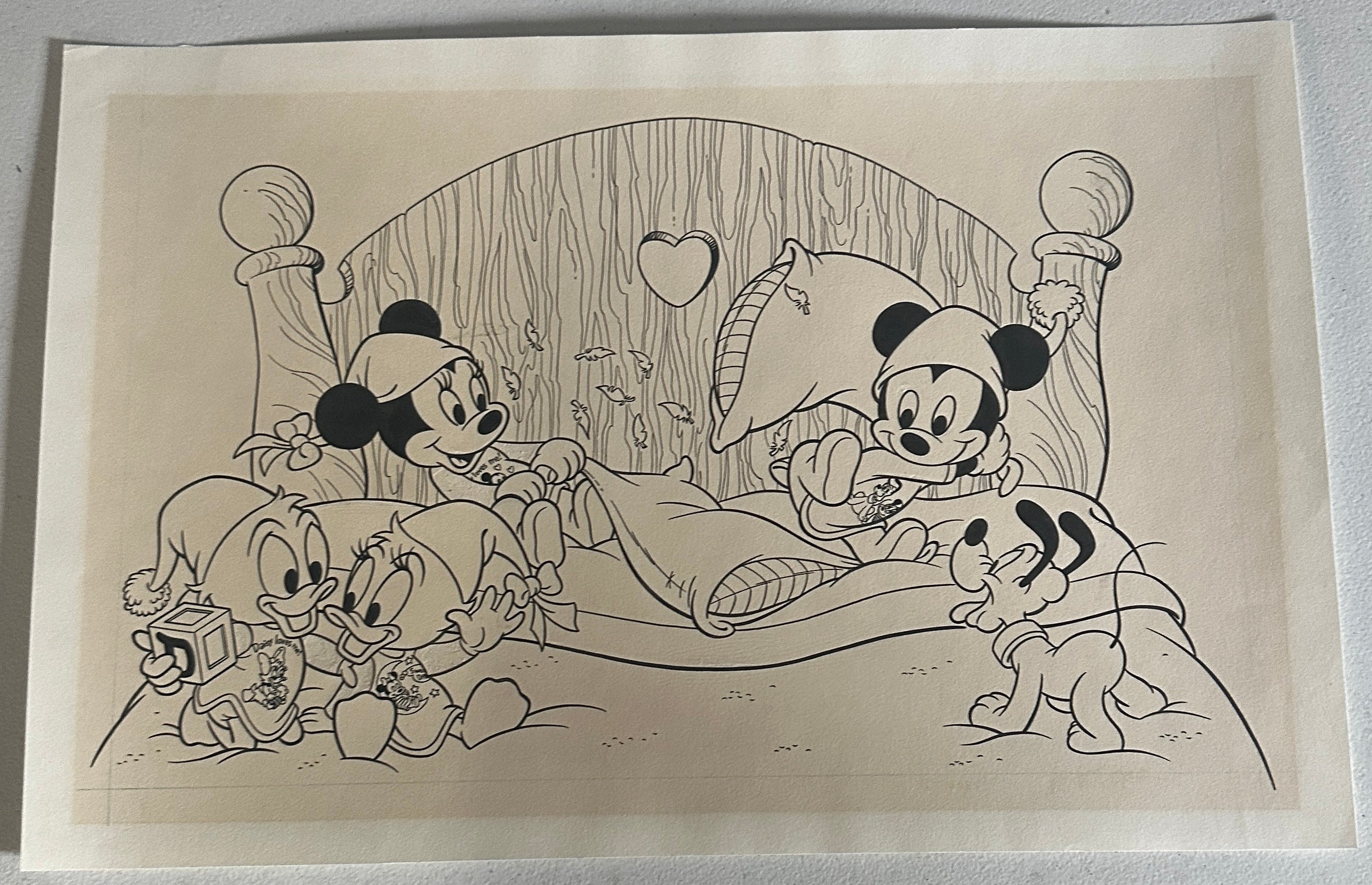 Offered here is an original Disney character artwork illustrated by Roman Arambula, featuring Mickey Mouse, Minnie Mouse, Donald Duck, Daisy Duck, and Pluto in a warm, playful bedtime scene. This is an authentic original production art piece, not a modern reproduction, capturing the classic Disney style that Arambula became known for during his long association with Disney comics and licensed artwork.