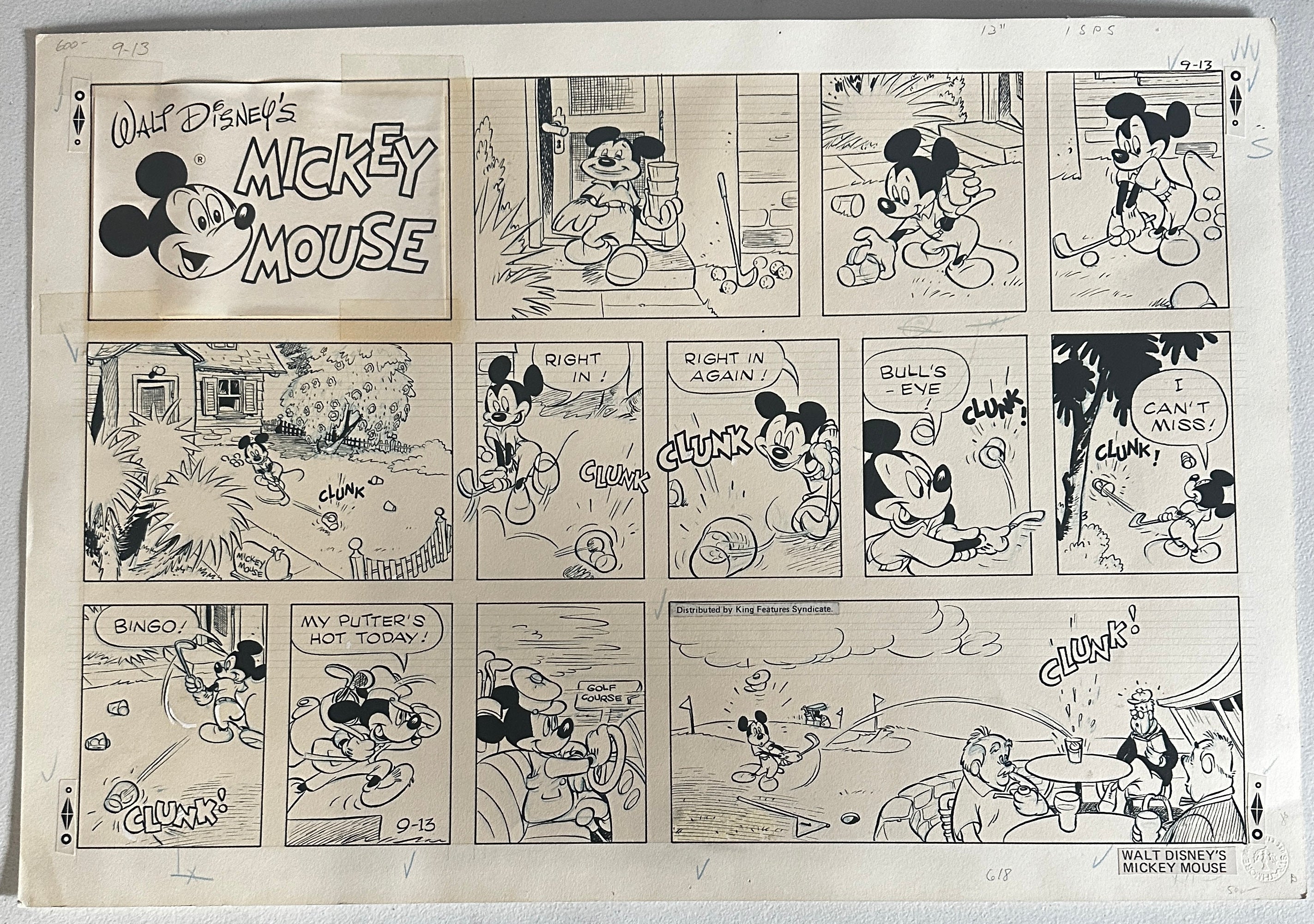 Offered here is an original Disney Mickey Mouse Sunday newspaper comic art page, illustrated by Roman Arambula and distributed by King Features Syndicate. This is a full Sunday page featuring Mickey in a golf-themed story, complete with multiple panels, sound effects, and the classic title header as originally published.