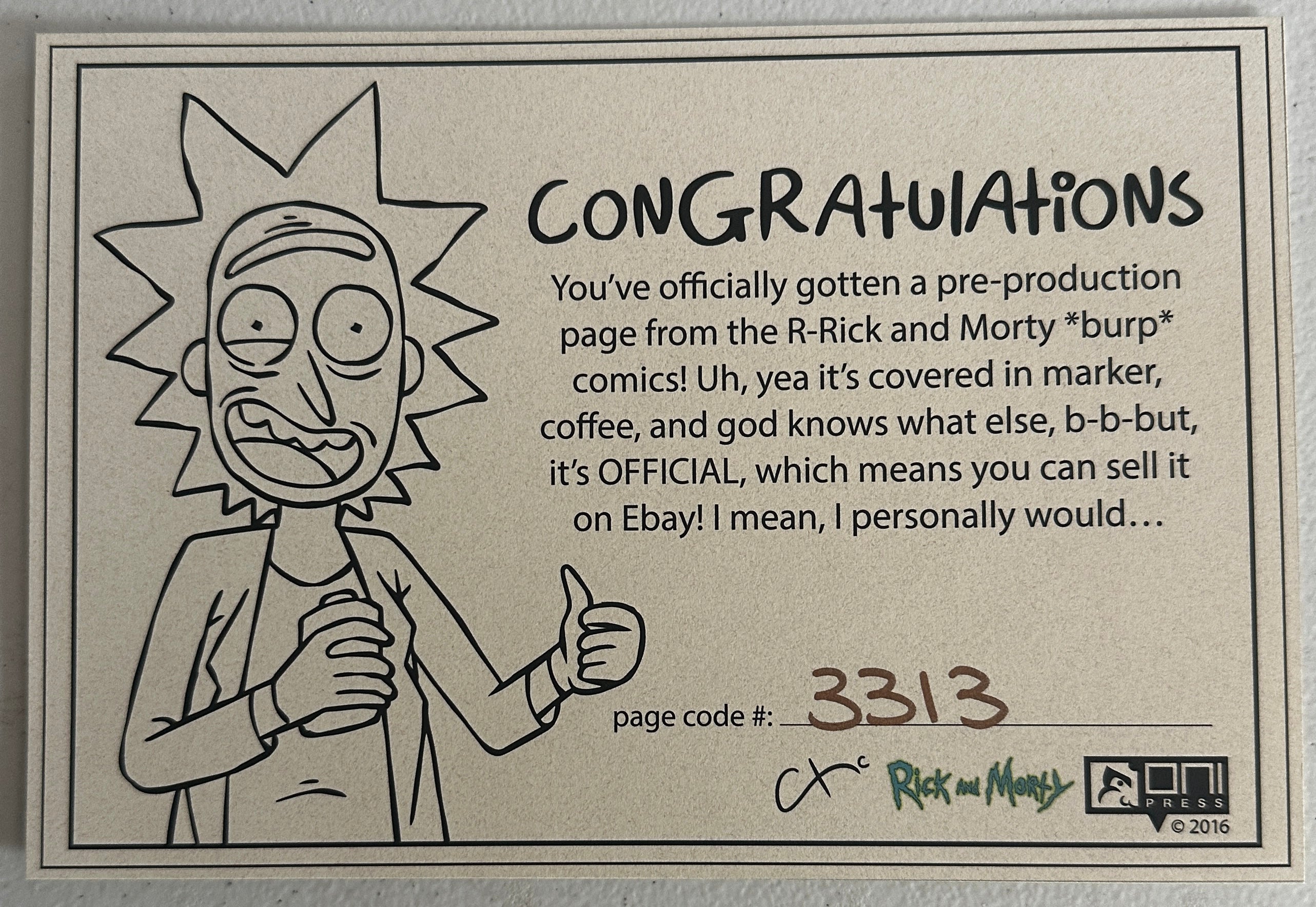 Page de pré-production exceptionnelle de Rick and Morty #33. Ce document provient directement des archives d'ONI Press et comprend un certificat d'authenticité et un autocollant d'authentification de leur part ! Superbe objet de collection pour les fans de Rick and Morty ! Dimensions : 8,5" x 11"