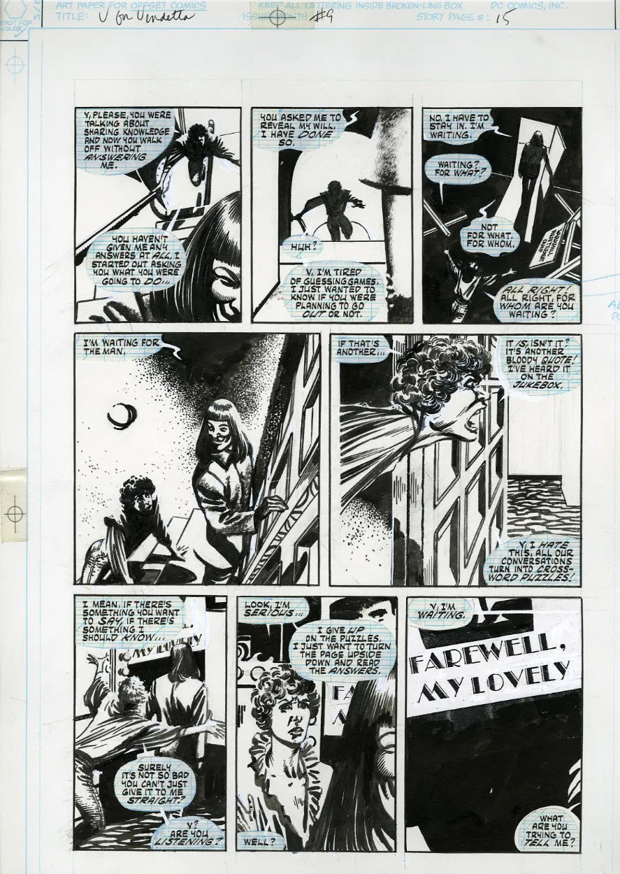 Une page de l'une de mes histoires préférées de tous les temps. V pour Vendetta a été créée par le maître Alan Moore. Il s'agit d'une page rare de la série limitée en 10 numéros, et elle est d'autant plus exceptionnelle qu'elle présente à la fois V et Evey.