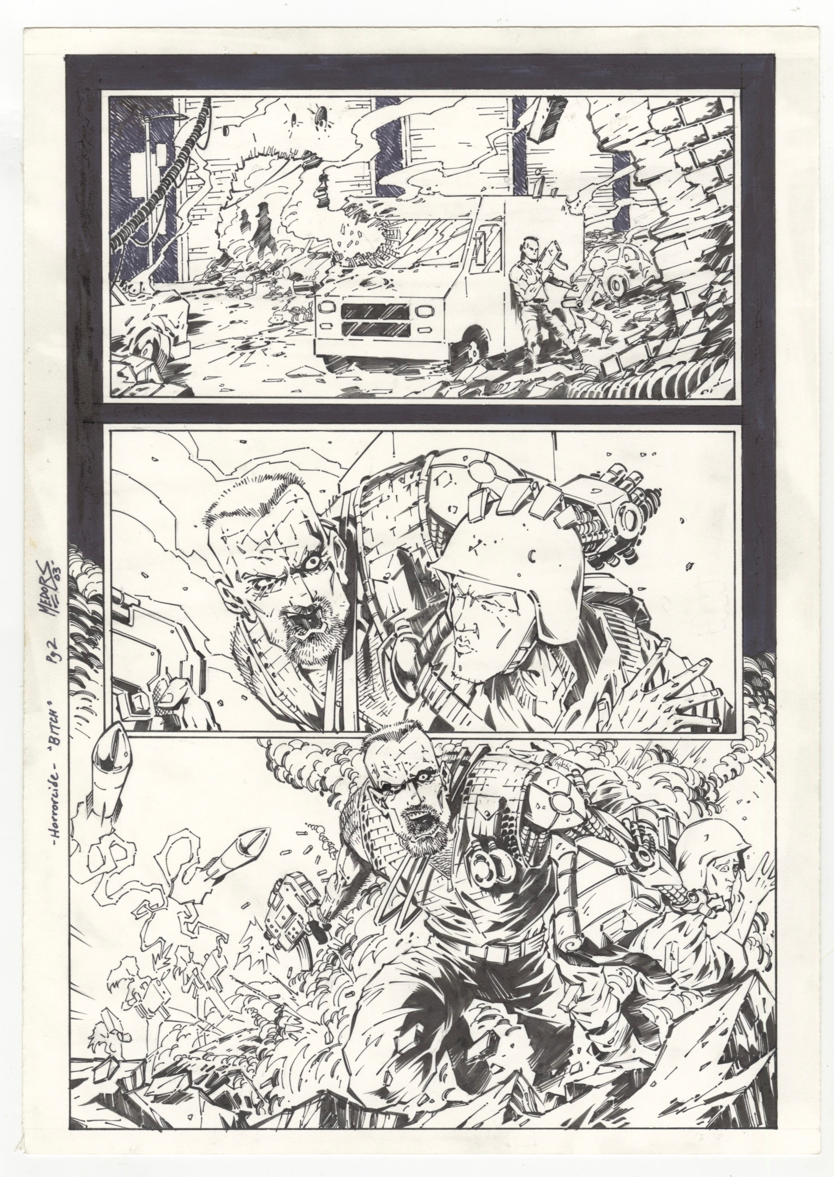 Laissez-vous plonger dans le monde complexe et détaillé de Horrorcide avec cette magnifique page publiée de l'histoire "Bitch" de ce comic. Avec des dessins originaux de Josh Medors. Il s'agit de l'illustration du comic IDW de 2004 et elle mesure environ 28 x 43 cm, ce qui en fait un ajout vraiment unique à toute collection.