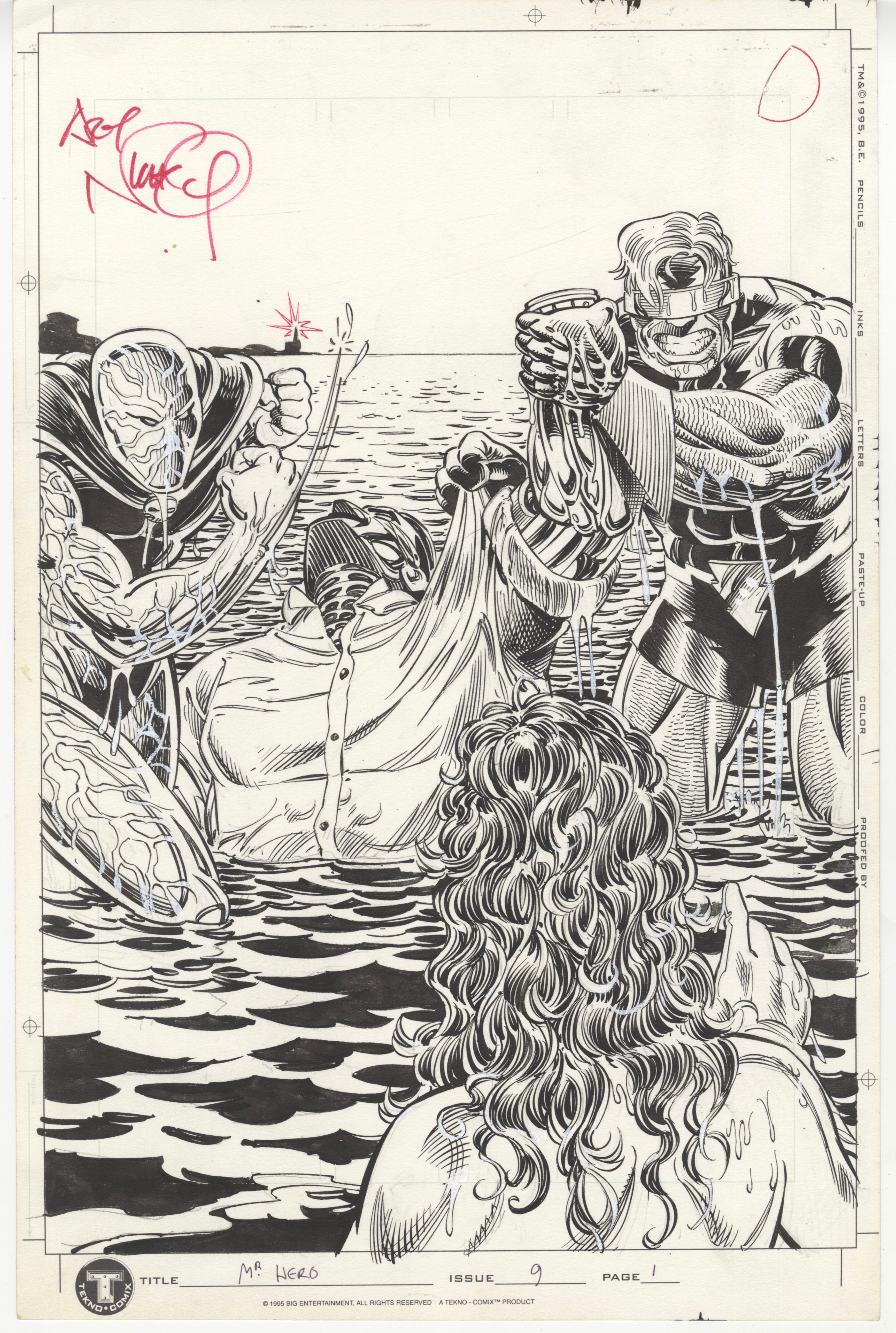 Page de titre originale du comic Mr. Hero #9 de Neil Gaiman, dessinée par Ted Slampyak.
