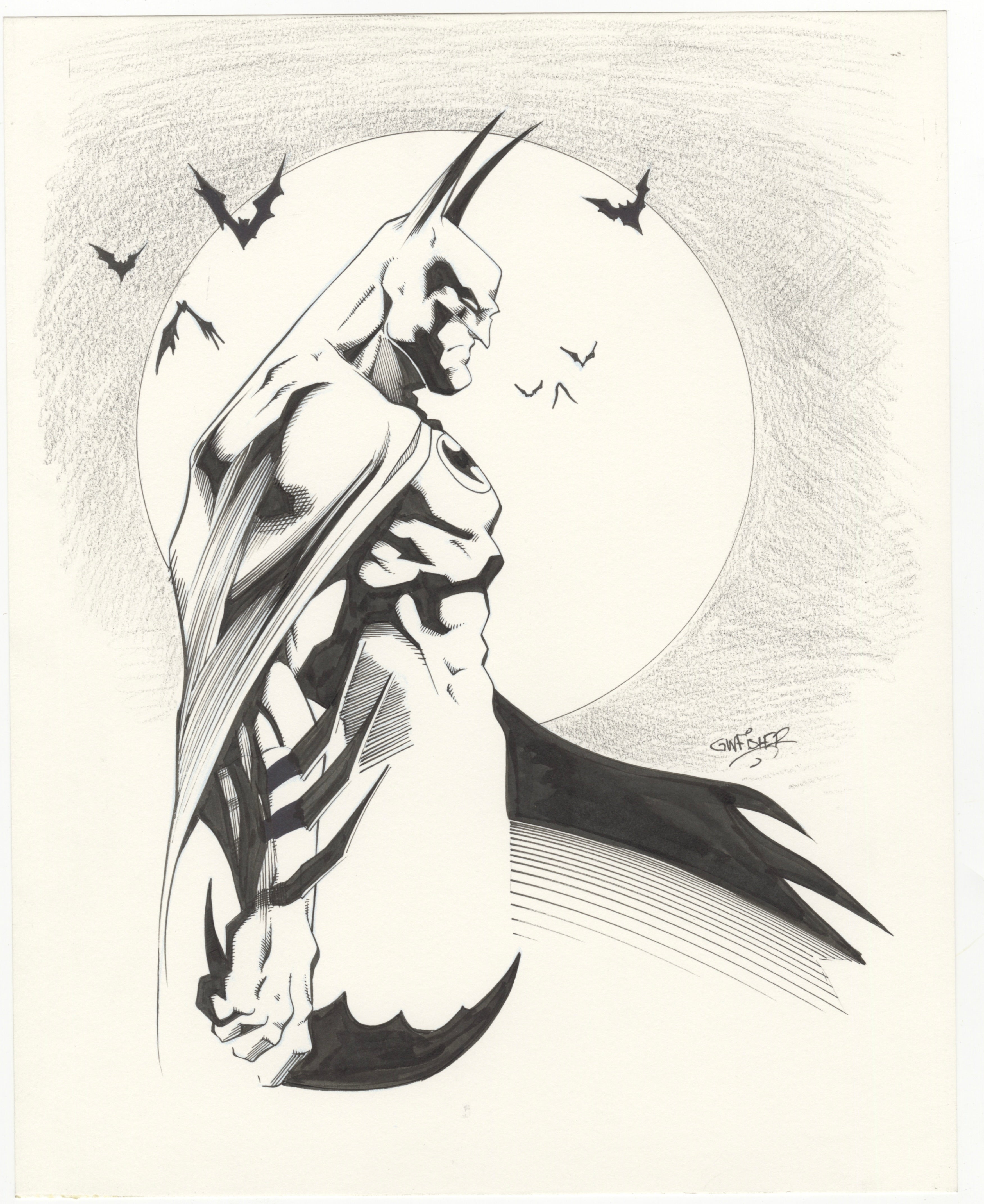 Ce dessin sur commande de BATMAN est une œuvre d'art dynamique aux couleurs vives et aux détails complexes, entièrement dessinée à la main. Il a été dessiné à Pittsburgh Comiccon en 2008. Superbe œuvre représentant Batman. Couleurs incroyables sur cette pièce de l'incroyable Hughes !