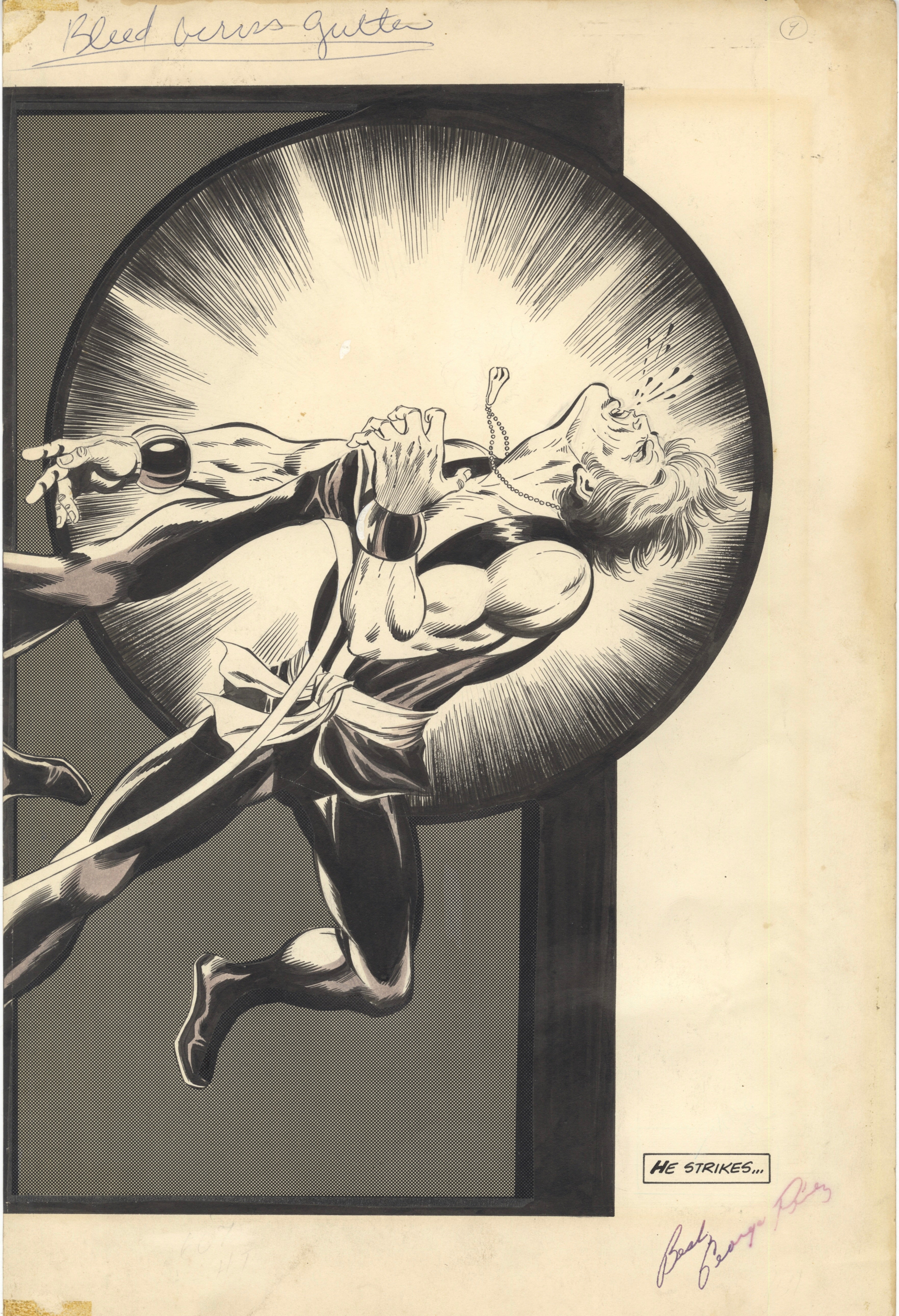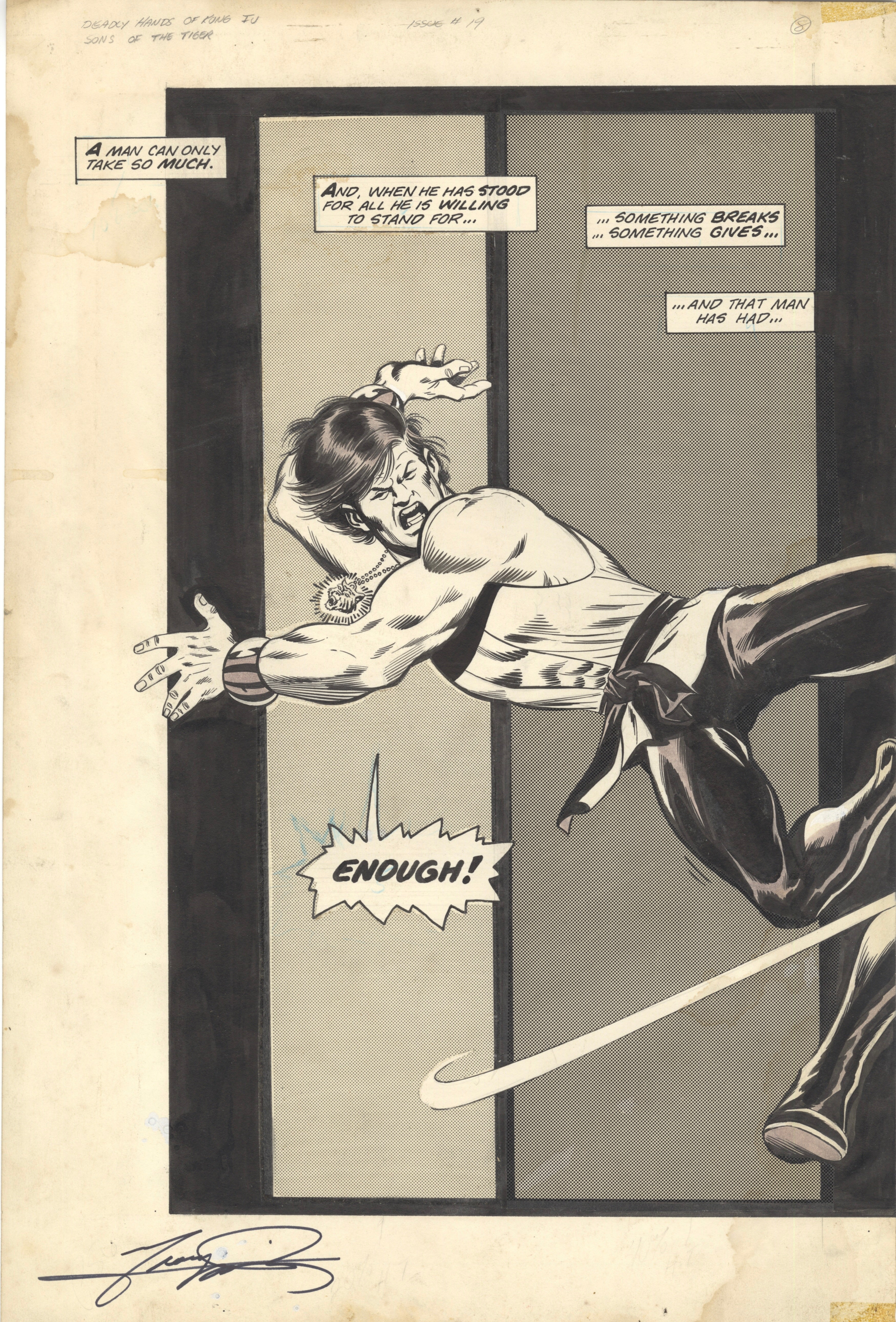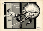 Questa rara pagina doppia (23 x 17 1/2 pollici) di Lin Sun e Bob Diamond è un vero capolavoro. Proveniente dalla leggendaria serie "Sons of the Tiger", questa pagina raffigura un memorabile combattimento tra Lin Sun e Bob Diamond per Lotus Shinchuko. La ricchezza di dettagli è una testimonianza dell'impegno dei creatori George Perez e Jack Abel. Si tratta di un lavoro molto precoce di Perez, aveva solo 21 anni quando lo disegnò!! Non perdete questa occasione di possedere un pezzo di storia dei fumetti.