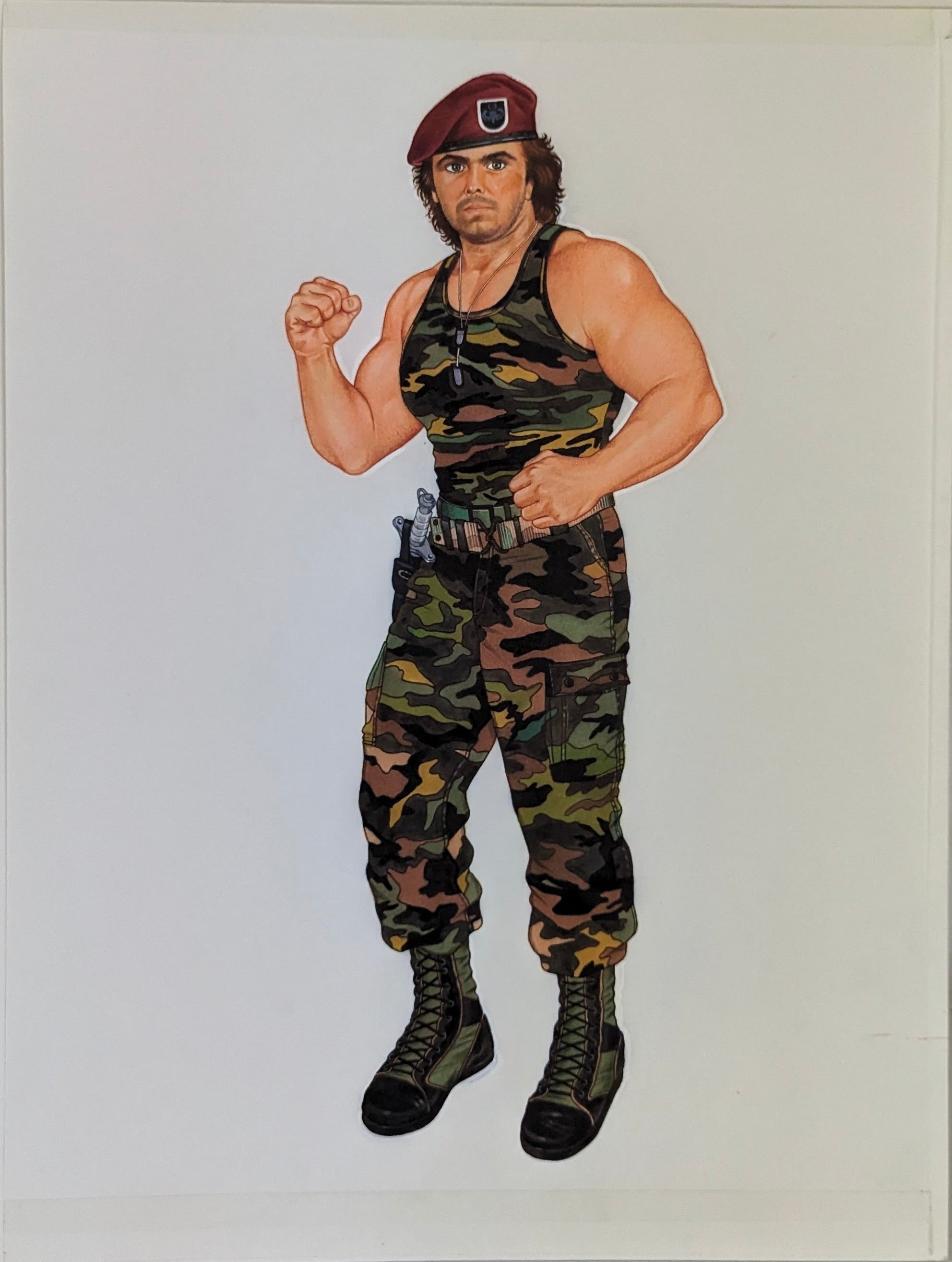 Possiedi un pezzo di storia del wrestling con questa opera d'arte originale, unica nel suo genere e pubblicata. Questo raro disegno a mano, realizzato con colori a matita e pennarelli, raffigura il Caporale Kirchner ed è L'opera originale utilizzata per il poster della confezione dei giocattoli LJN Wrestling Superstars. Davvero un pezzo unico dell'età d'oro del wrestling.