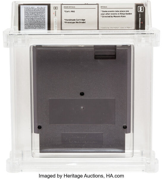 Ninja Gaiden II: The Dark Sword of Chaos Prototype (NES, Tecmo, 1990) Certificato Wata. Questa cartuccia di test interna del secondo gioco della serie Ninja Gaiden è stata realizzata a mano dagli sviluppatori. Presenta un'etichetta stampata e fatta a mano con la scritta "Level 5 Sample" scritta a mano. È stata testata e risultata funzionante al momento della certificazione. I prototipi sono essenzialmente l'arte originale del mondo dei videogiochi e non ricevono un punteggio, ma vengono certificati come autentici.