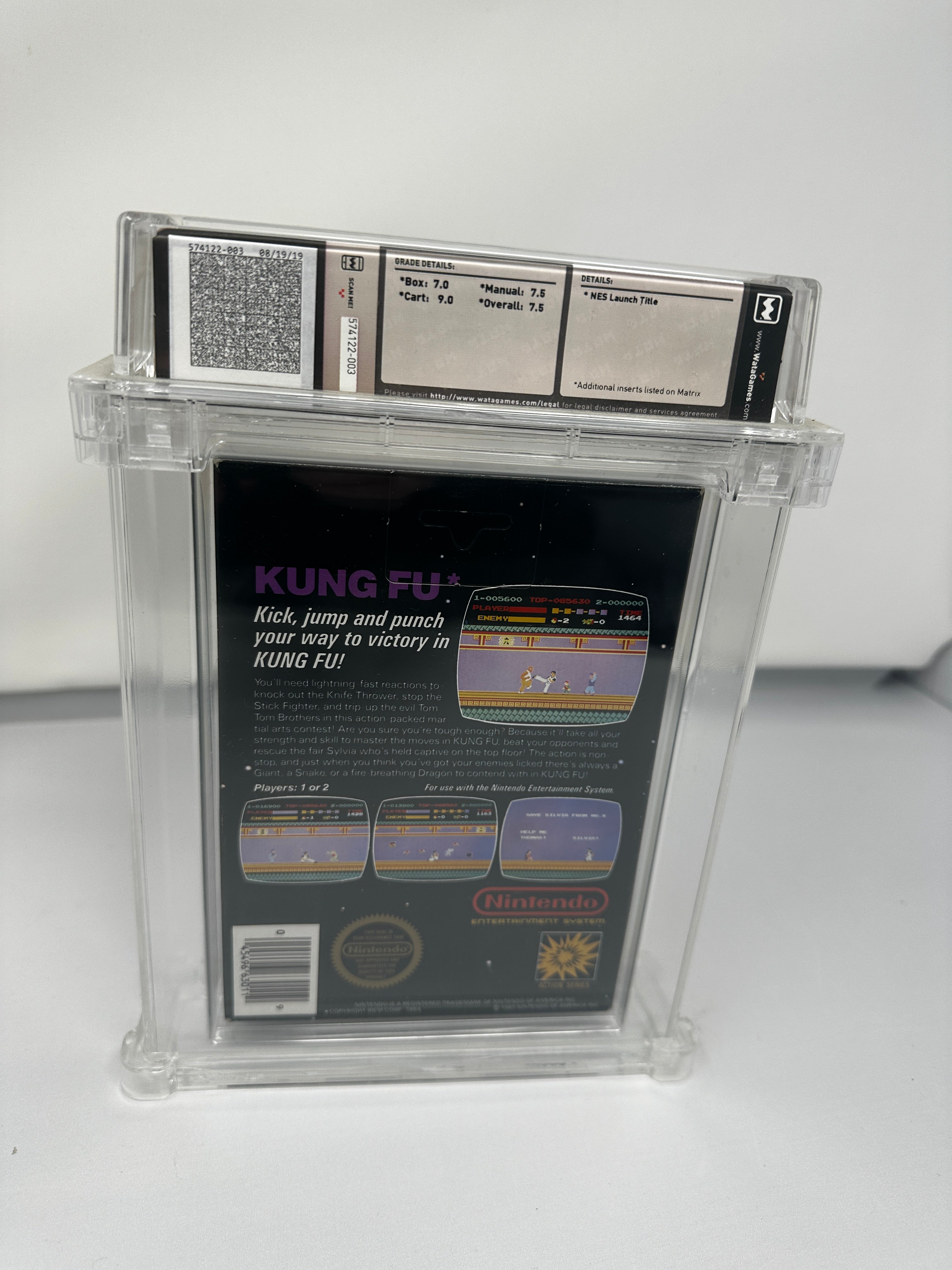 Kung Fu - Wata 7.5 CIB [Adesivo lucido, seconda produzione], NES Nintendo 1985 USA. [Scatola: 7.0; Manuale: 7.5; Cartuccia: 9.0; Totale: 7.5] Sebbene alcuni titoli in scatola nera possano attirare più attenzione, la discreta importanza di Kung Fu non dovrebbe mai essere sottovalutata. Questo gioco ha offerto a innumerevoli giocatori l'iniziazione al mondo dell'azione picchiaduro a scorrimento laterale del suo tempo. Radicato nel successo arcade del 1984 di Data East, Kung-Fu Master , Kung Fu rappresenta un trampolino di lancio nella storia dei videogiochi, contribuendo a preparare la strada a classici intramontabili come Double Dragon e Final Fight . Wata osserva: "Componenti corrispondenti".