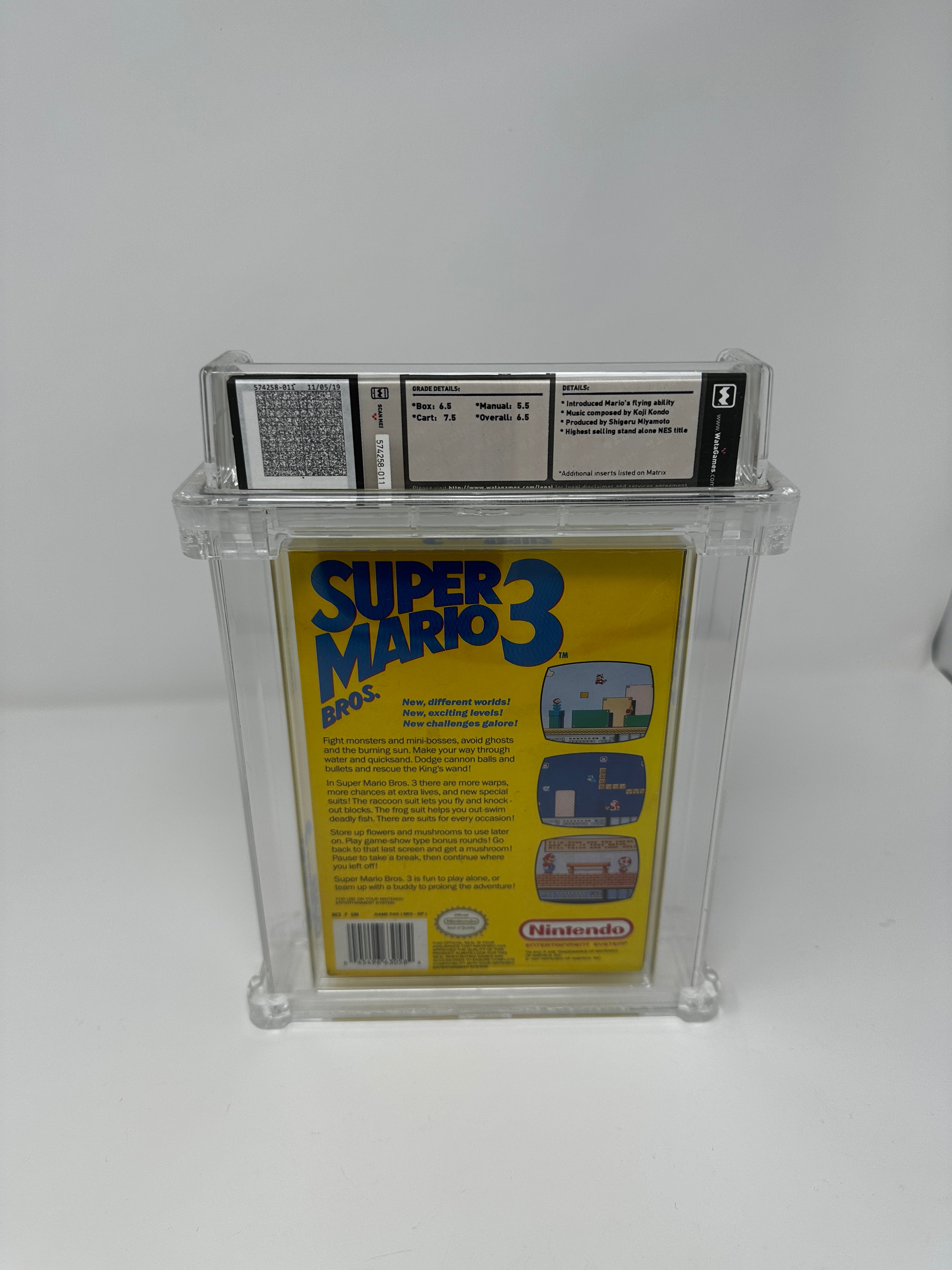 Super Mario Bros. 3 - Wata 6.5 CIB ["Bros." a sinistra, prima produzione], NES Nintendo 1990 USA. La variante "Bros. a sinistra" indica che questa copia proviene dalla prima tiratura. Successivamente "Bros." è stato spostato a destra, appena sopra il cappello di Mario, per migliorare l'estetica della composizione dell'immagine sulla scatola. Il primo gioco di Mario a presentare una mappa del mondo e un sistema di inventario per i potenziamenti, Super Mario Bros. 3 ha anche introdotto la capacità di volo di Mario.
