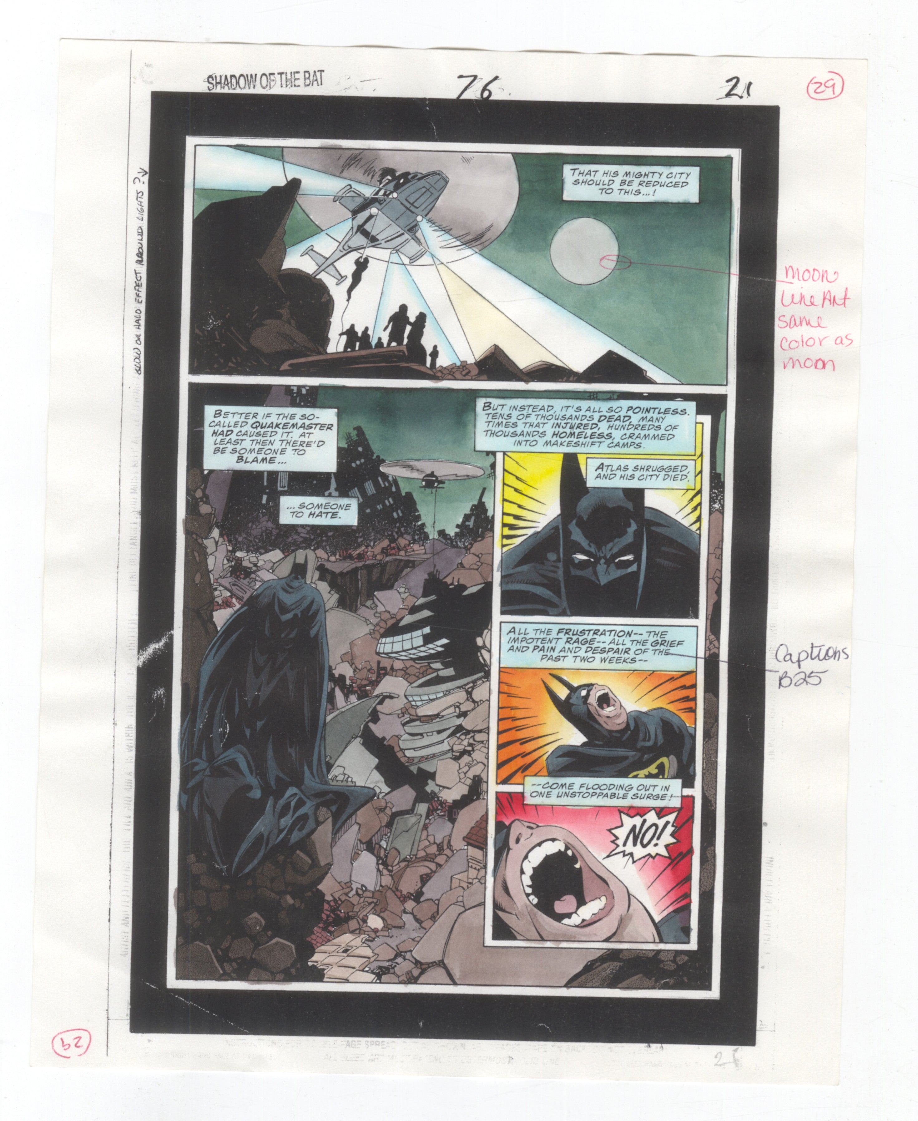 Up for sale is an original production color guide from DC Comics for BATMAN: Shadow of the Bat, identified on the sheet as issue 76, page 21. This is a full comic-page production/color guide with handwritten color callouts, margin notes and printer marks. It is a great piece for collectors of original comic art, production ephemera, and Batman material.