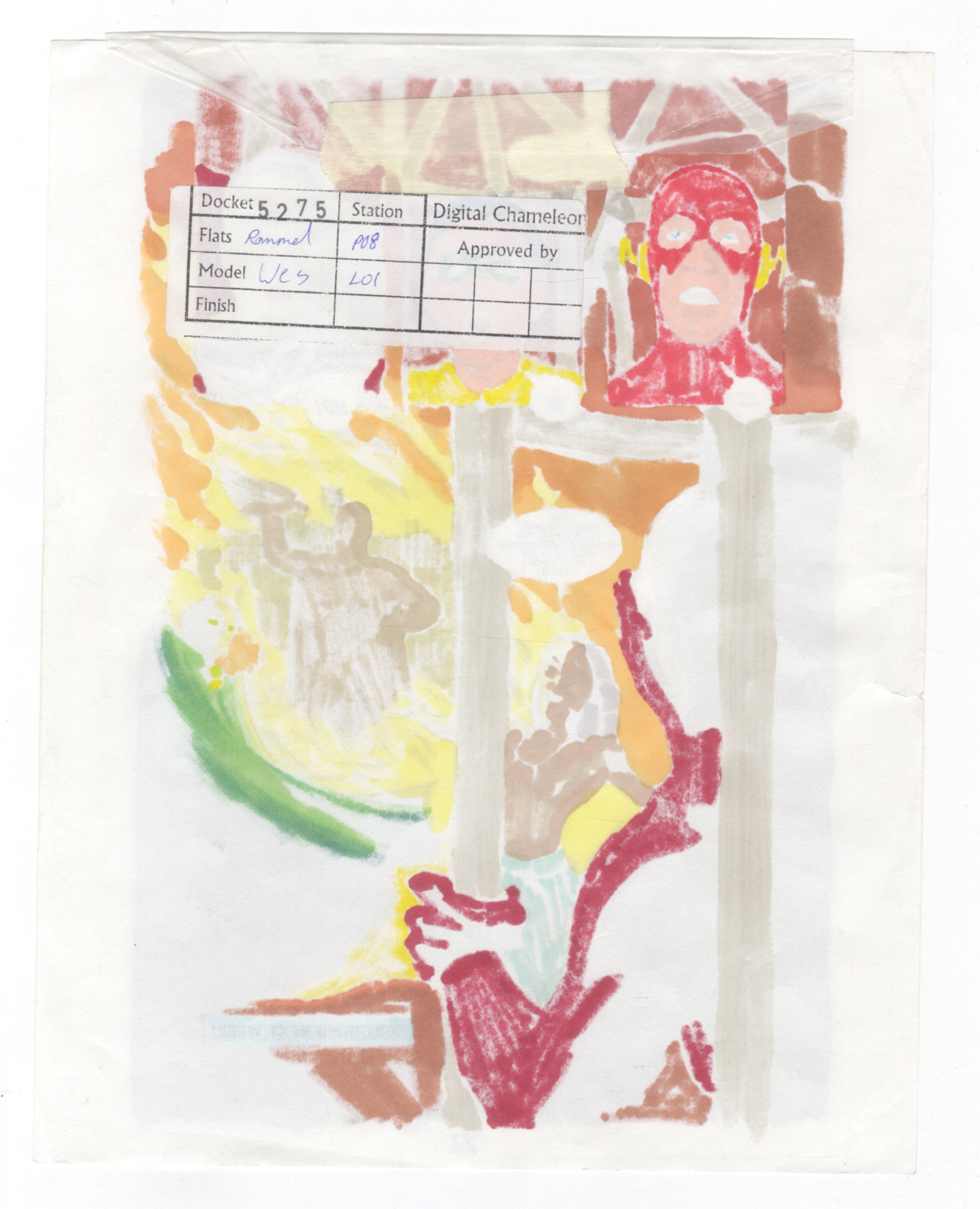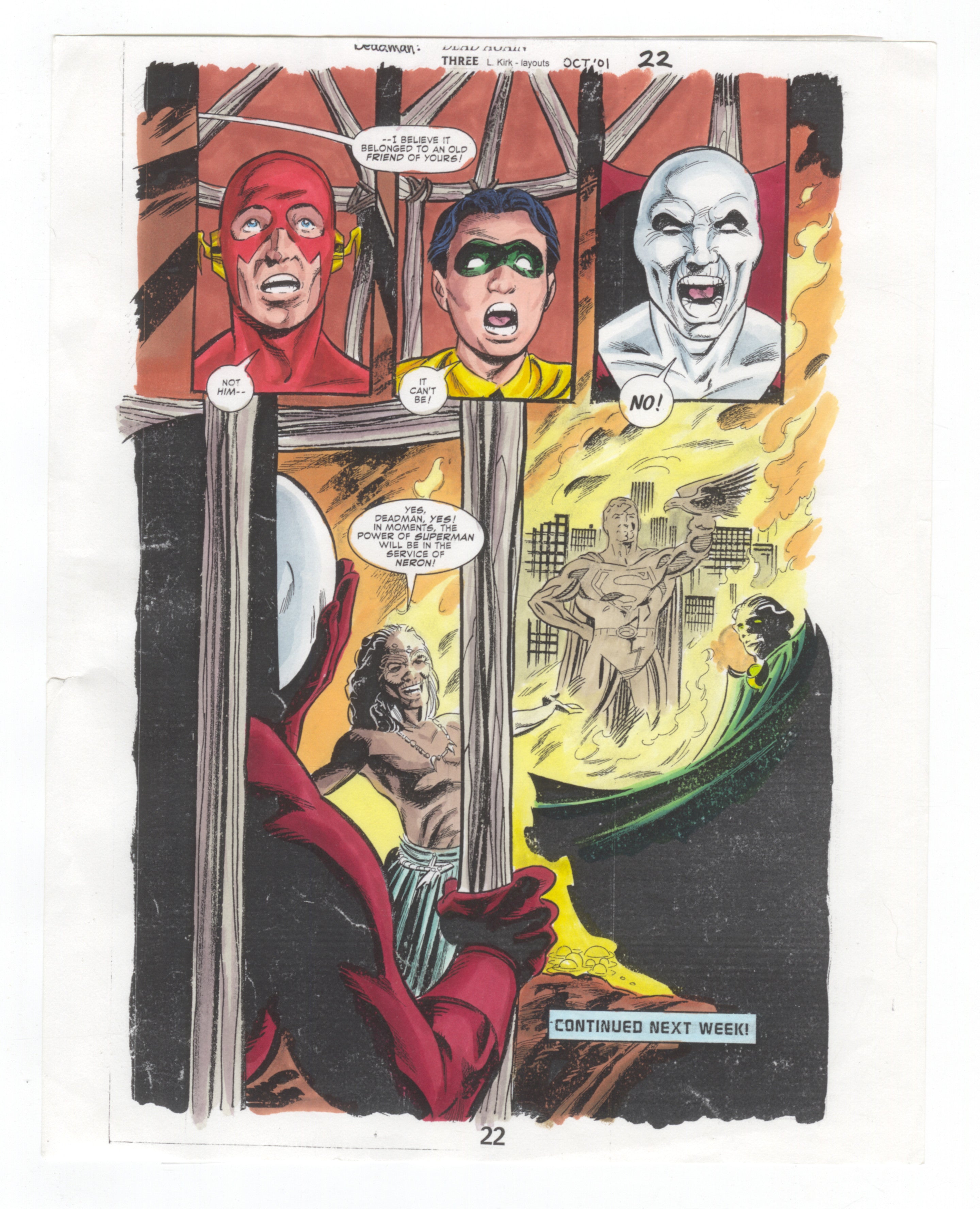 This is an authentic original comic production color guide from Deadman: Dead Again #3, Page 22, featuring the Flash, Robin, Deadman, and a dramatic Superman resurrection sequence. Hand-colored by the production team with publisher markings, this piece was used in creating the final printed comic. A one-of-a-kind behind-the-scenes artifact—perfect for collectors of DC Comics, the Flash, Deadman, Superman lore, and original production art.